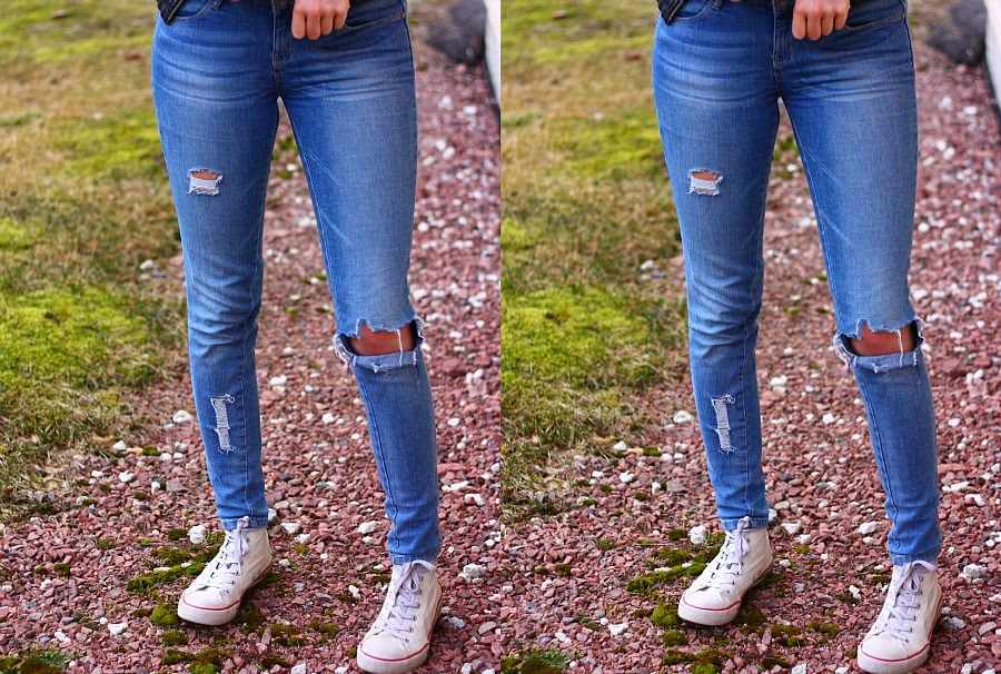 Reikäfarkut olivat muotia jo vuosikymmeniä sitten. Nyt ei kuitenkaan enää puhuta mistään nyhtöfarkuista. Nää kevätsäät on antanu hyvän syyn käyttää reikäfarkkuja, vaikka ne onki aika kesäset. Mut nii kauan kun mä en jäädy tonne ulos noilla niin . Uudet reikäfarkut, reijät pari isompaa ja muut pienempiä niinkuin tänä päivänä muodissa on.